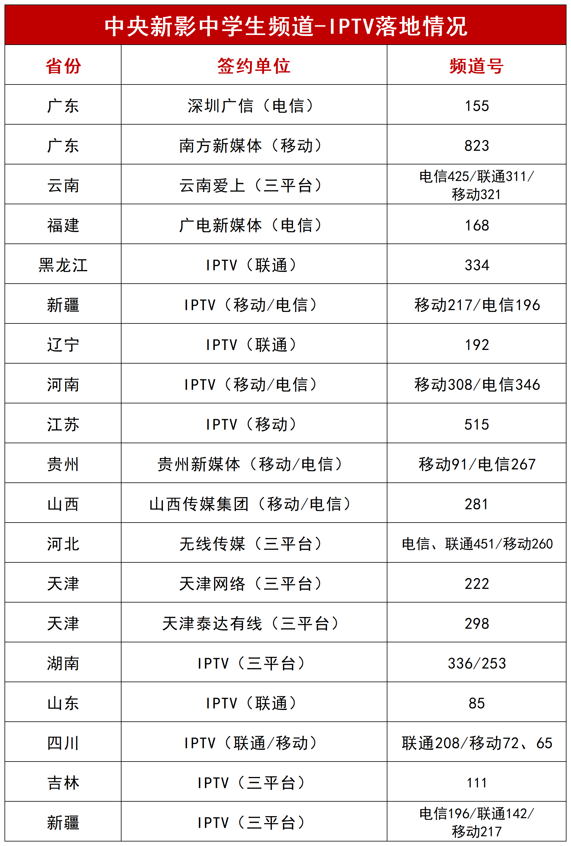 各省市IPTV落地情况如下: